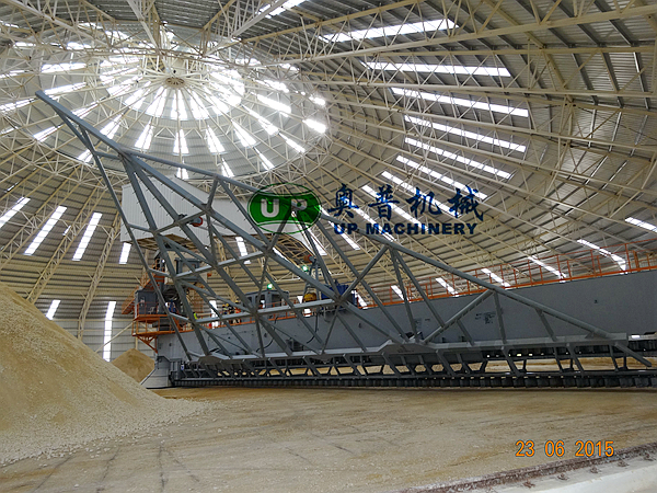 - 圓形料場用堆取料機首要情勢有:刮板式堆取料機、刮斗式堆取料機。